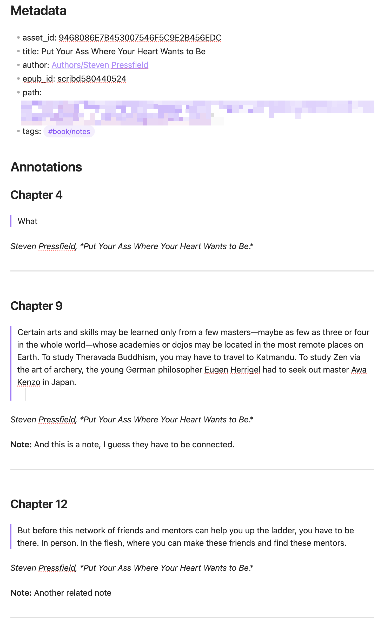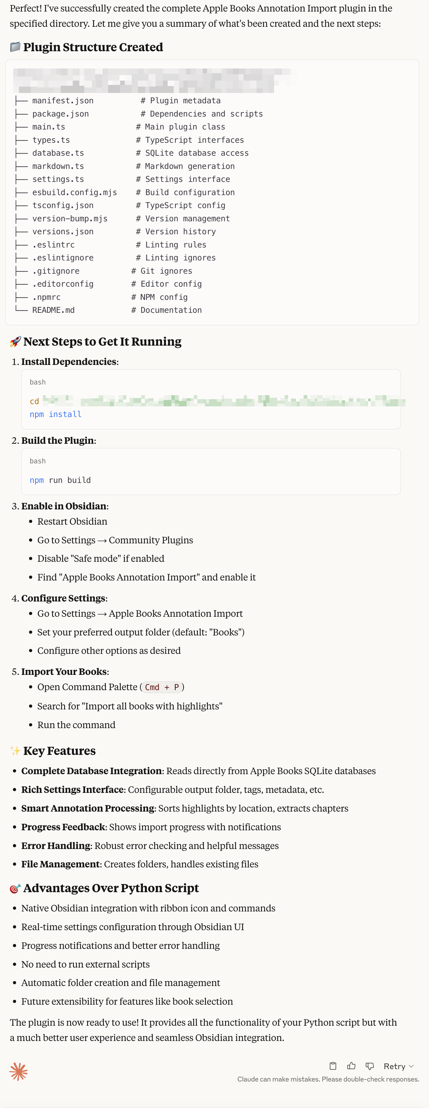 Then I discovered that Apple Books stored all these highlights and notes in an open though hard to find and hard to understand SQLite database. So I wrote a Python script to import Apple Books annotations, using example from sources like this Calibre plugin repo and used the Obsidian Python Scripter plugin to run it from Obsidian. I only had AI help when I ran into issues for the first script and wrote most of it myself.