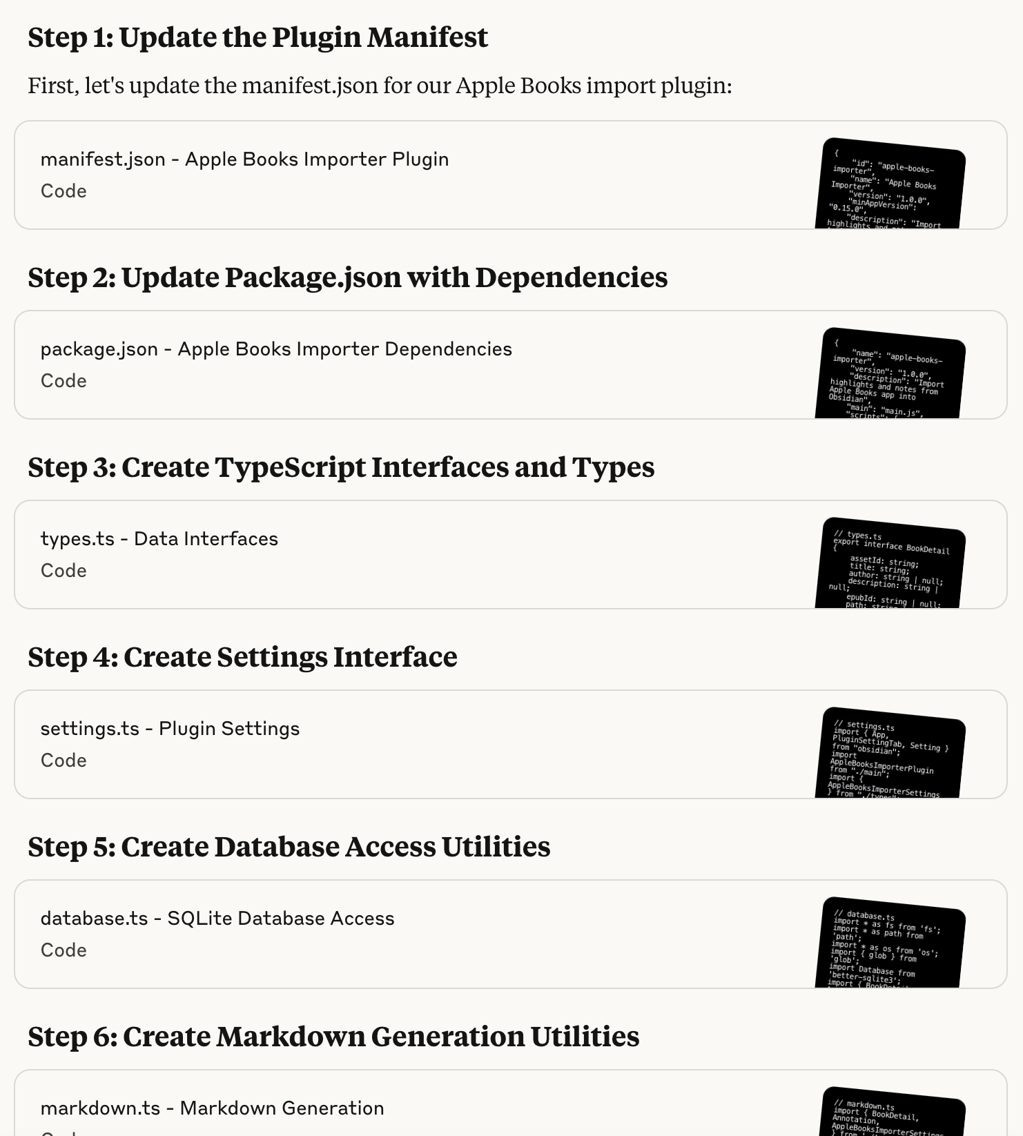 I have attached a Python script to import apple books annotations. I have also attached the Obsidian plugin sample for reference. I have also attached an article on how an older version of the Python script integrates with Obsidian. Help me create an Obsidian plugin that does the same thing, step by step.
