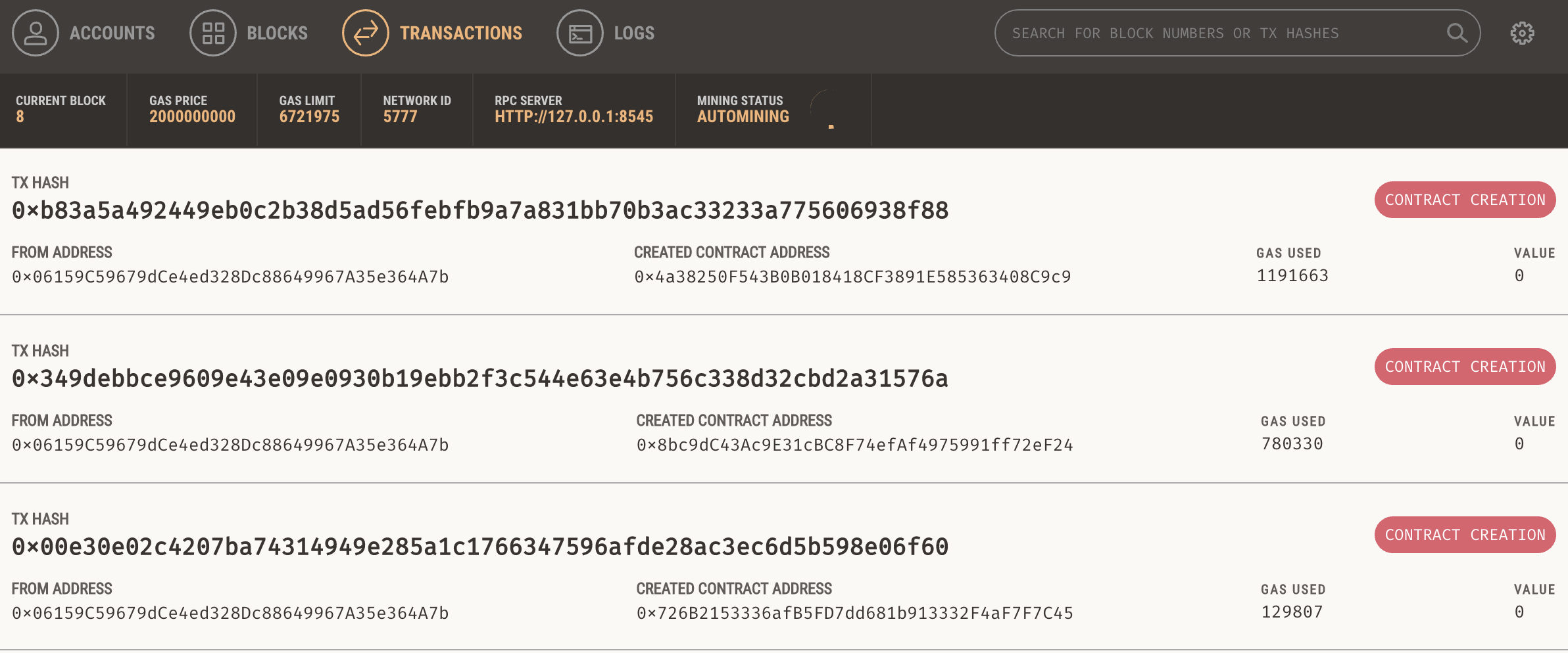 You should now see the transactions for these contracts in the Transactions tab of Ganache.