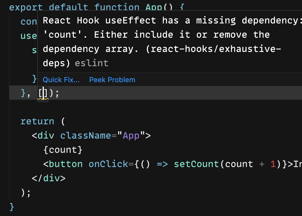 You will see that lint gives you a couple of options. Either adding count to the dependency array or removing the dependency array altogether. If you remove the dependency array, the function inside will run on every render. I guess this is ok, but it defeats the purpose of having the useEffect in the first place. So the obvious answer is add the count variable to the dependency array. In VS Code, with the ESlint extension, and in other IDE’s with similar functionality, you can click on the Quick Fix link and count will be added to the dependency array for you.
