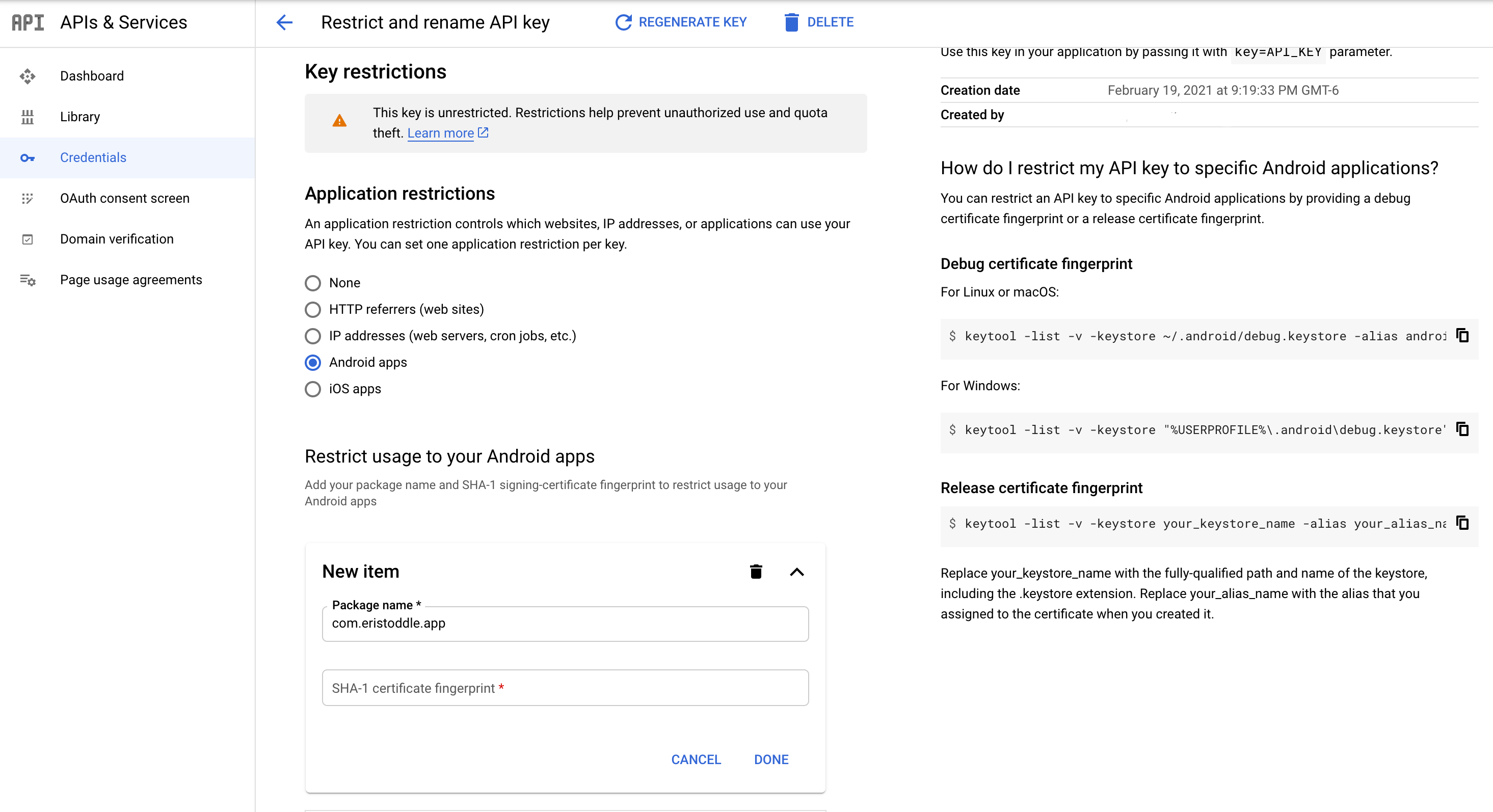 I know you just want to get things working and then you will get back to it. Do it now. This is a story specifically about the Google Cloud Platform, but I’m sure the lesson can be applied elsewhere. For GCP, you just have to login and go to the API key in question and in the edit screen and choose Android apps under Application restrictions. Then click ADD AN ITEM. There you will have to add the package name of the app you will be restricting the key to. To get the certificate fingerprint for the other field in the from, you can copy the command and follow the instructions on the right side of the page. It takes a few minutes.