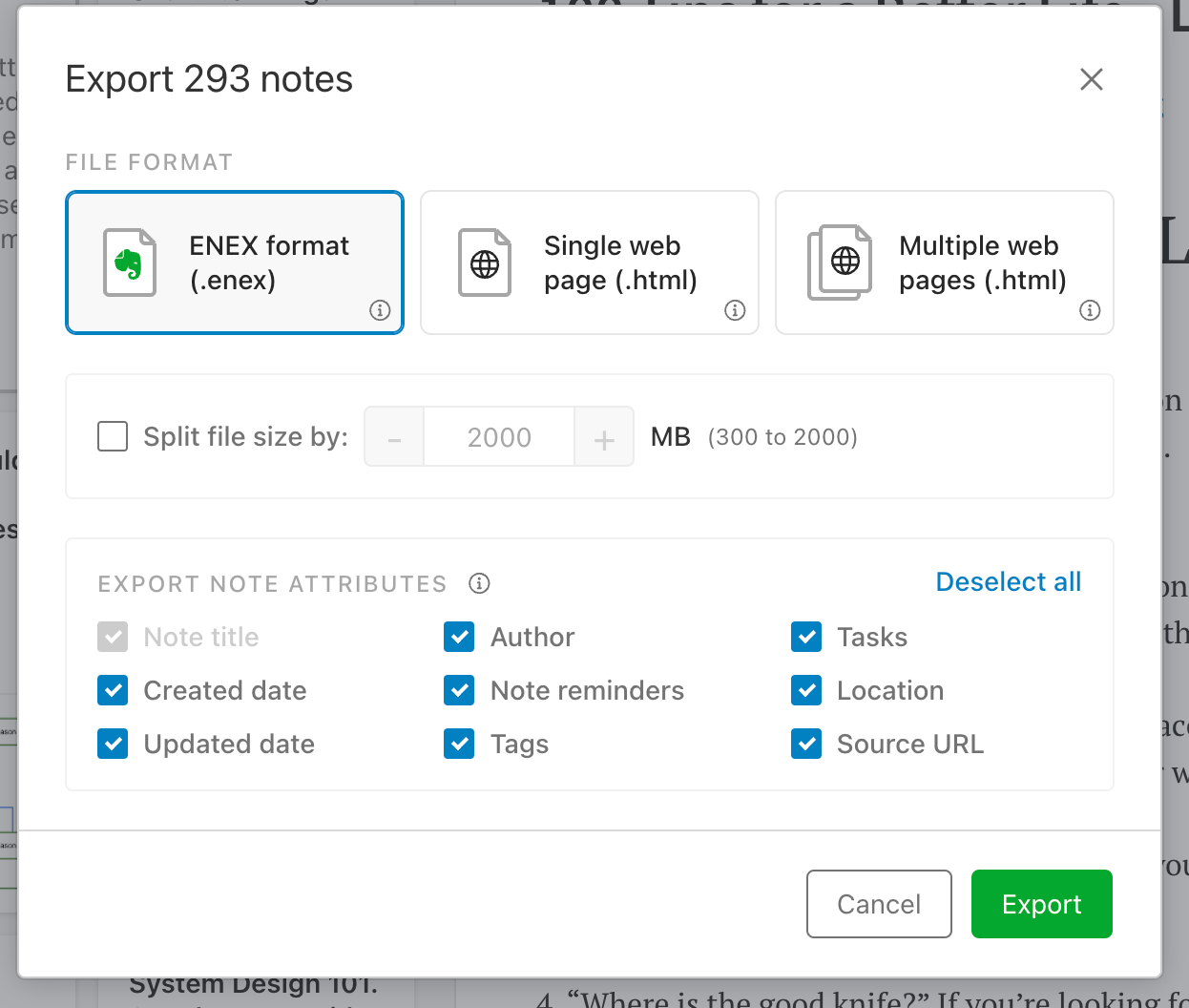 Then choose the ENEX format option and click Export: