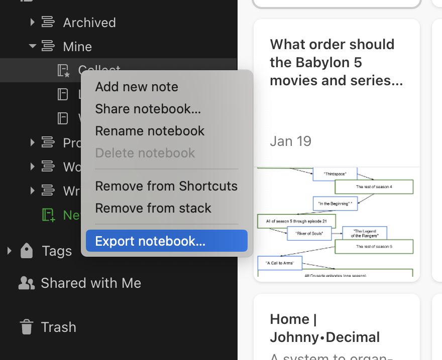 Believe me, I looked for ways around this, but it seems to be the only way and I only found the option on the desktop app. So for each Evernote notebook you want to export for Joplin, you’ll have to right click on the notebook (stacks won’t work) and click Export notebook: