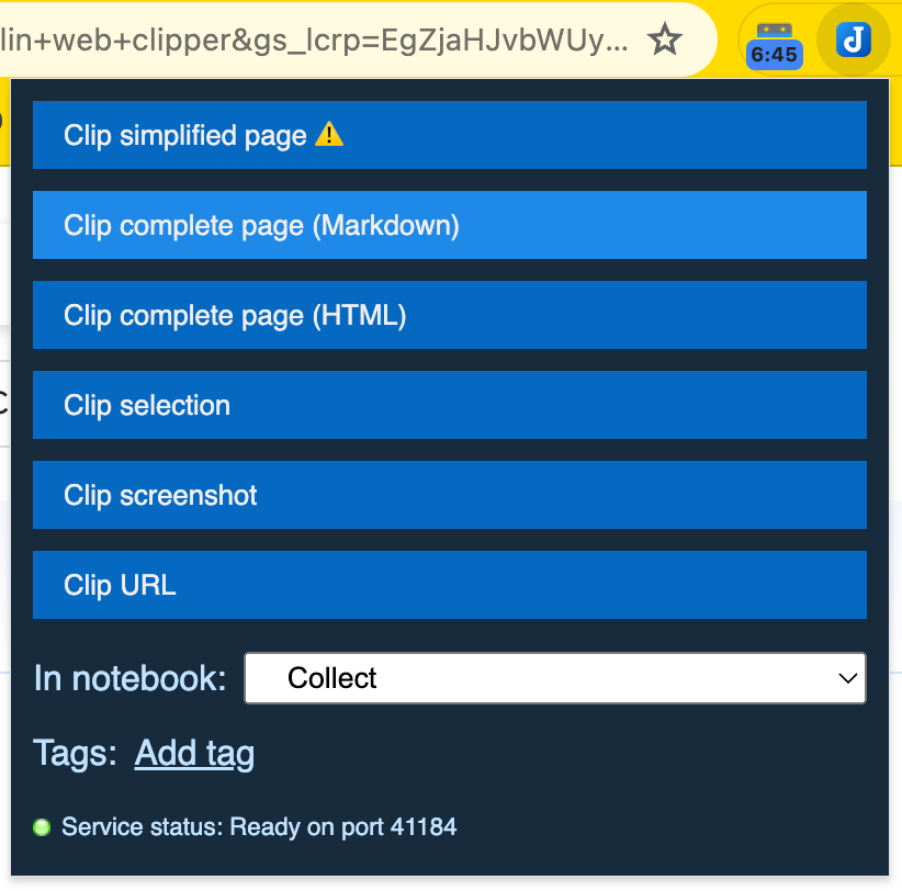 Joplin has a decent web clipper. I haven’t had any issues with it, but it does take a two-step process to setup. First install the clipper in your browser: