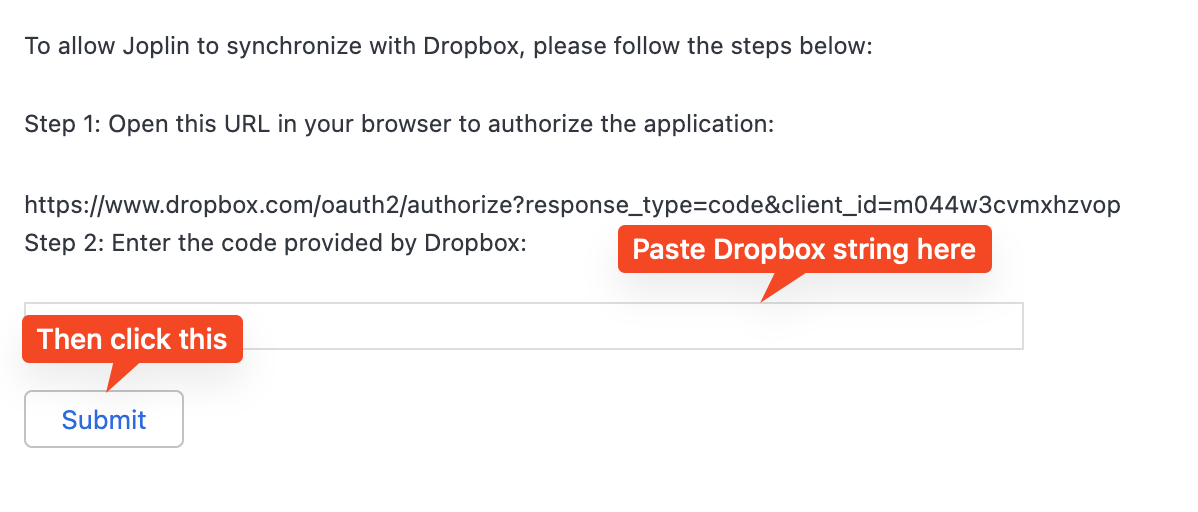 Once you click Allow you will be given a code to paste back into the form in Joplin: