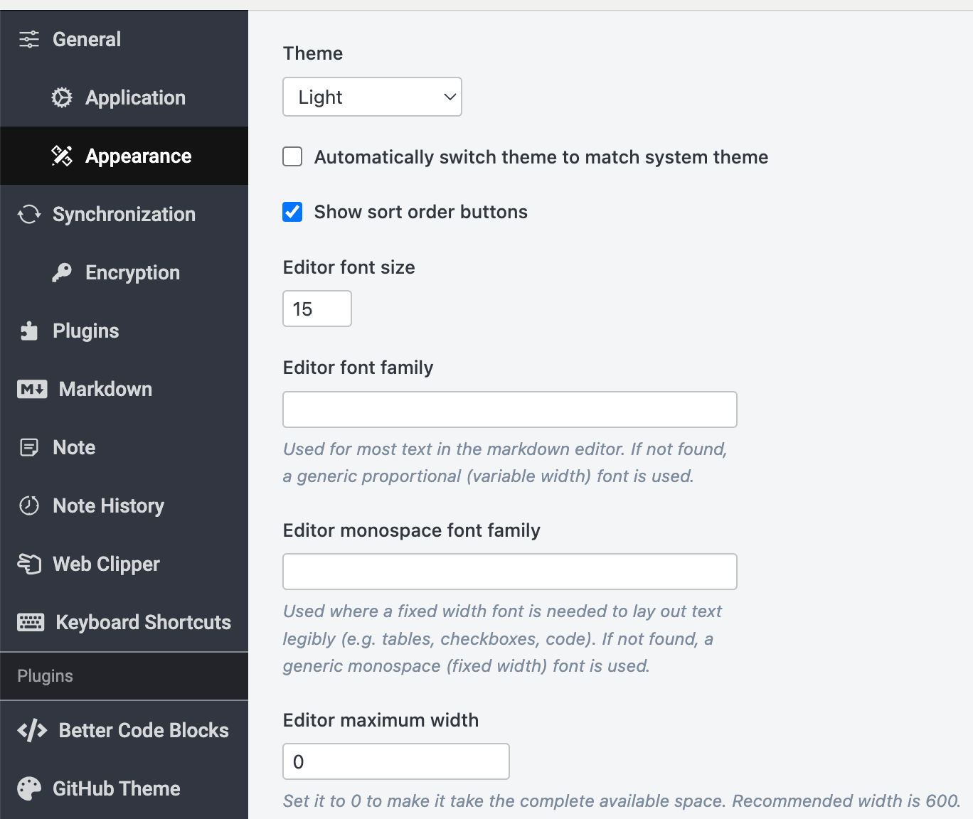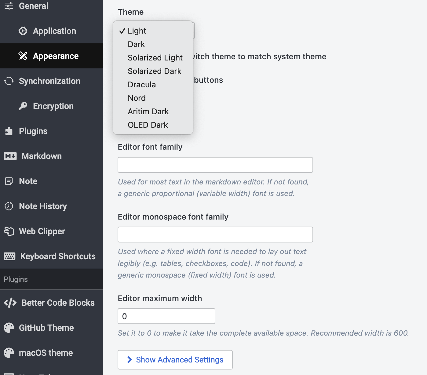 But you can also find themes for Joplin on the plugin site. Each will have it’s own settings. I found I liked the macOs theme the best.