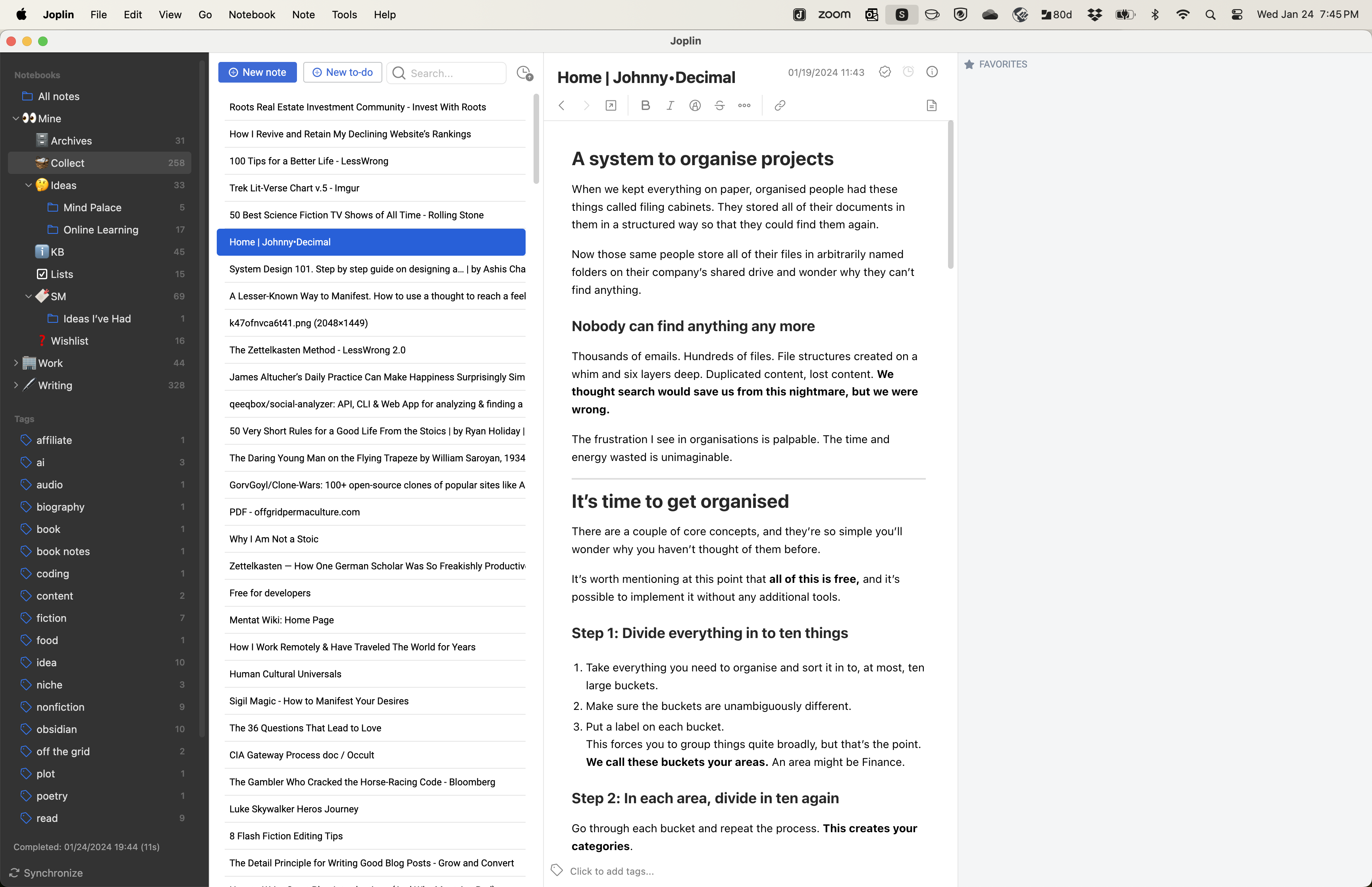 - Joplin: Organize stuff that I’ve collected with Clipper. If it is something that is interesting and I don’t know where it fits yet, I add tags and move it to the KB (Knowledge Base) notebook. If I have collected notes for something I am working on in Obsidian, group them into a notebook and export them to Obsidian. But the new Obsidian Web Clipper might have me changing my mind about this process.
