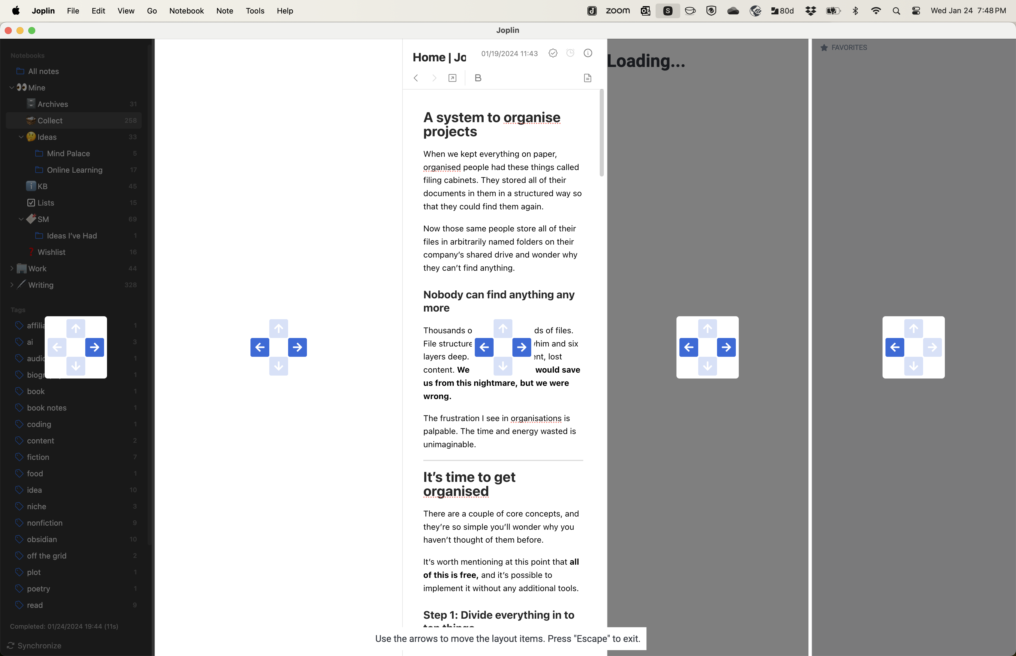 Loading.... It never showed except in this mode. So I just ignored them. - I never quite figured out how to save the layout and get out of this mode. I wasn’t sure if escaping like the message on the bottom says saved it. But quitting Joplin in this mode when I got my layout the way I wanted worked.