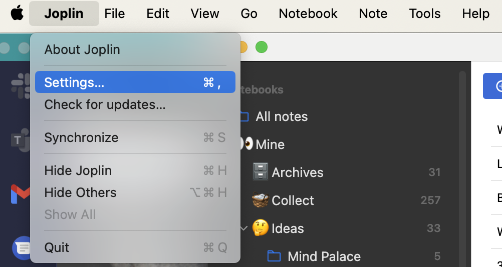Then go to Settings in Joplin: