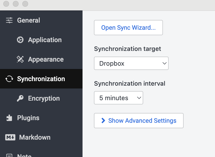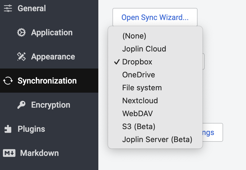 I am syncing my notebooks with Dropbox and if you are using Dropbox, Joplin Cloud, or OneDrive, click on Open Sync Wizard and choose your service: