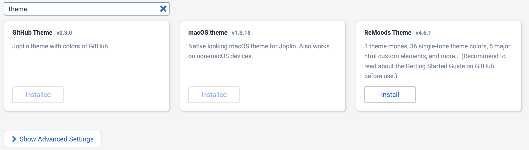 I will be referring to some Joplin plugins which you can find listed here. To install them, just find them on the site, then go to Settings > Plugins and search for them by name and click the Install button and then restart to enable it: