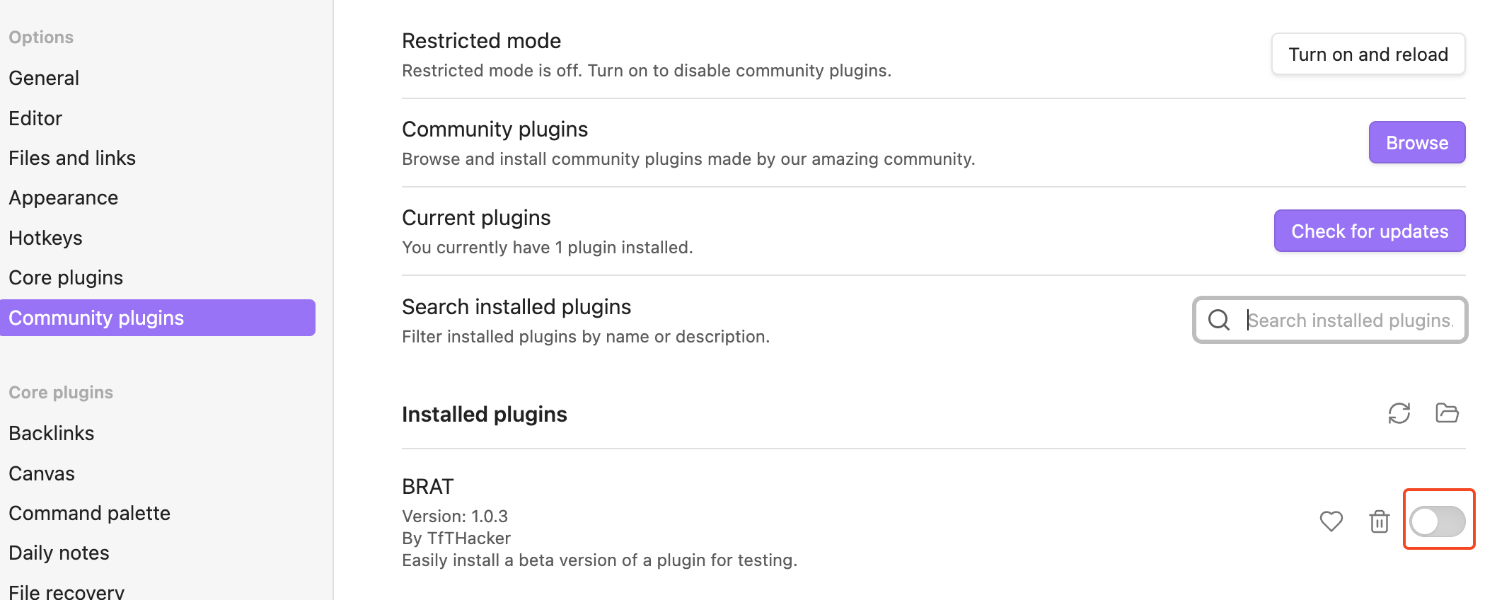 I write this section because I always forget to activate the plugin. I find something new, click install, and want to see what it does. If you are installing a beta Obsidian plugin with BRAT, you can check the box to enable it after update. But I don’t know how many times I went closed the settings menu to see new features and saw nothing. So back to settings to enable the plugin.