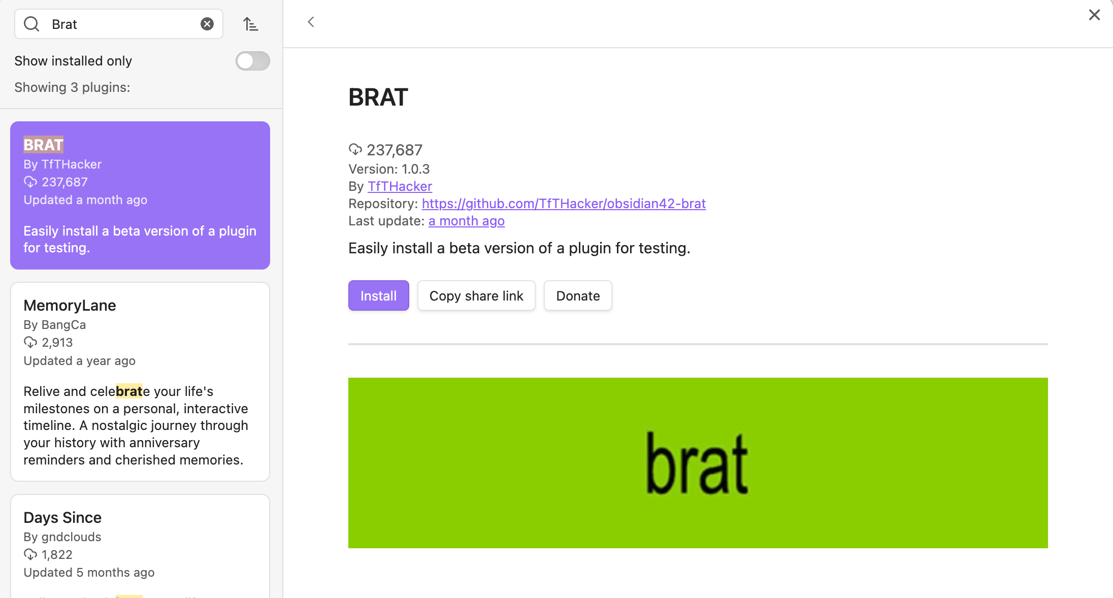 The BRAT plugin is for beta Obsidian plugins and themes. It stands for “Beta Reviewers Update Tool.” It allows you to install plugins that are still in development, but not yet in the list of community plugins. A good way to find beta Obisidian plugins is looking for “Add plugin” in the pull request list for obsidian-releases. Another place is the Share & showcase Obsidian forum.