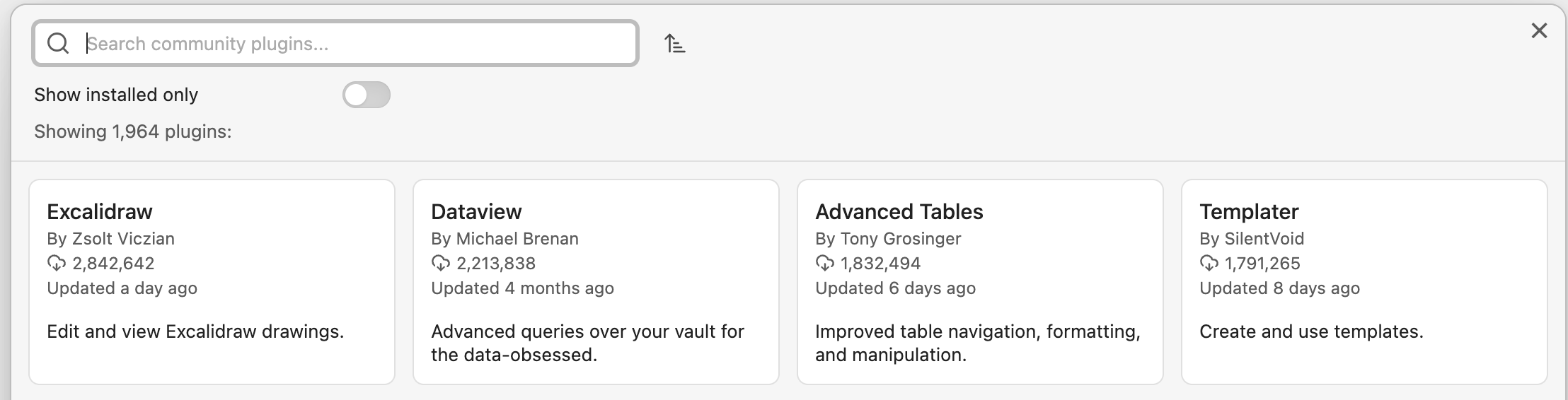 And that’s all for now. This started as a simple “how to install Obsidian plugins” post, but grew to much more as I researched all the various ways you can do so. But for most use cases, all you really have to do is search for plugins inside of Obsidian and click install when you find them.
