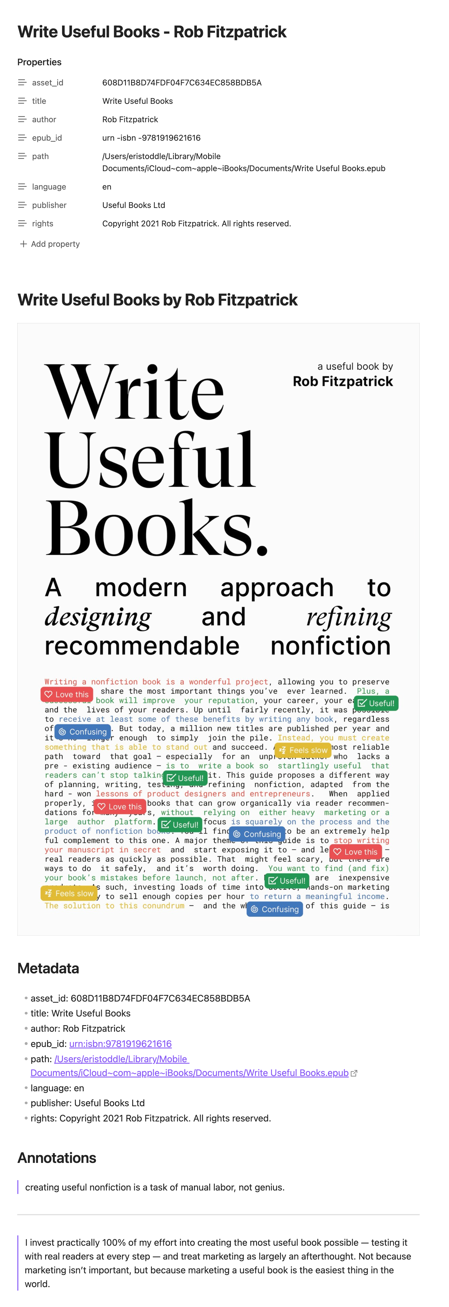 I am actually just as familiar with JavaScript as I am with Python, but I am not as familiar with the Obsidian plugin API yet and I know how fiddly I can get with UI, features, and configuration. So I started with Python instead of figuring that and the ebook part out at the same time. With the Python script, I could prototype the interactions with the Books db and be sure everything would work. It actually worked better than expected, which surprised me. I pulled more data than Readwise did.