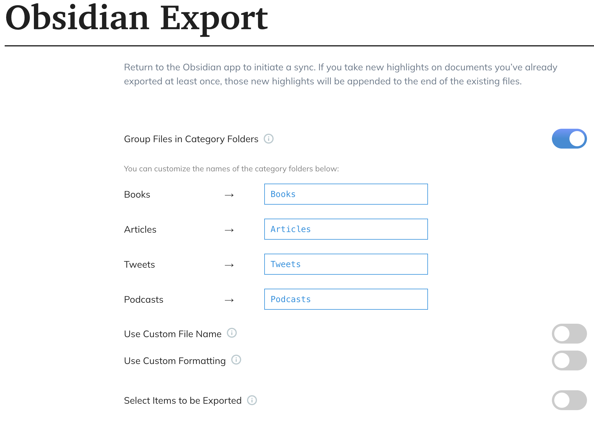 But these aren’t all the settings for the import. Part of the configuration is on the Readwise site in the export configuration page. You can get there by clicking on the Customize button.