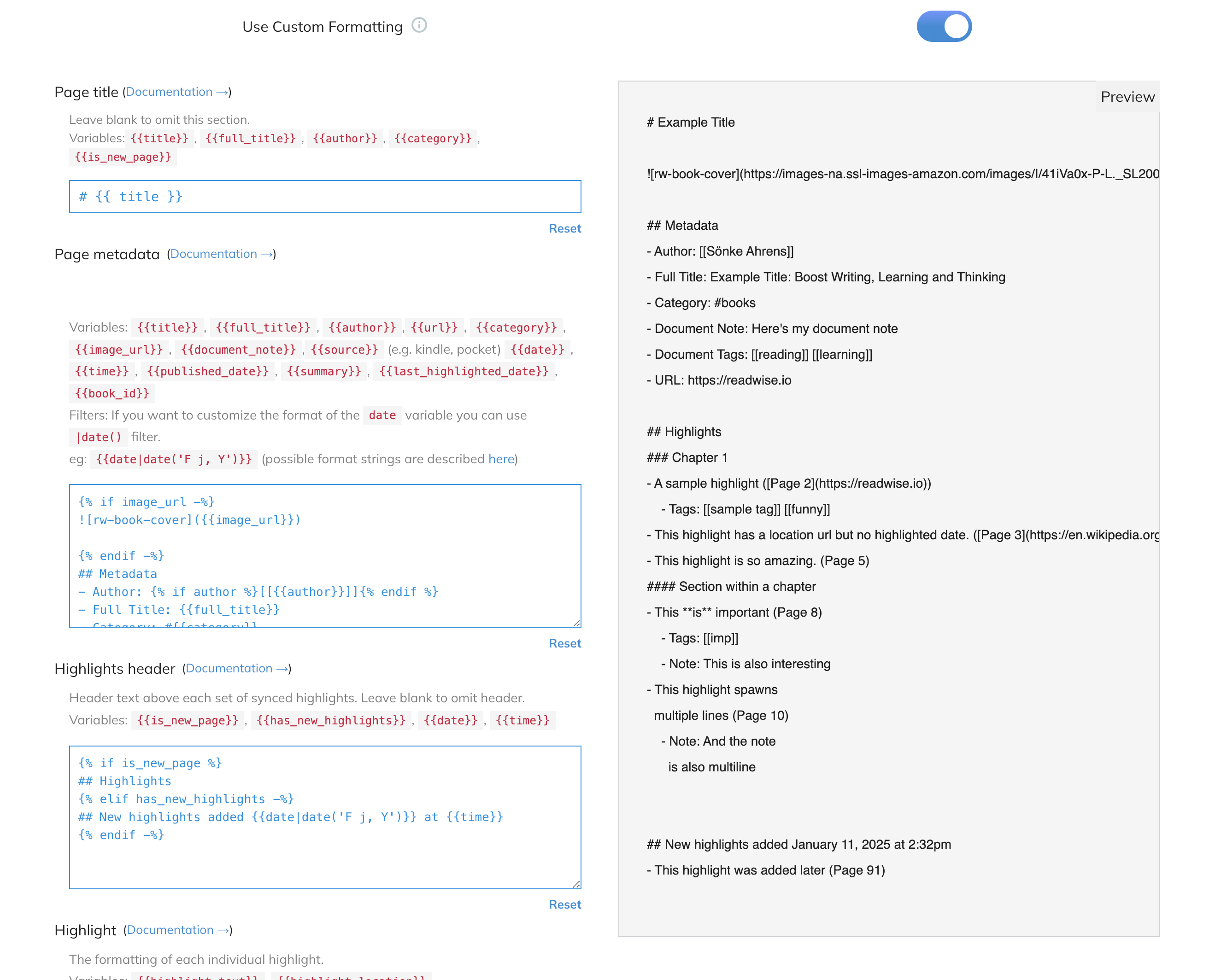 One thing I’ve planned to get to but haven’t yet is customizing the template for the export by clicking on Use Custom Formatting, because by default it doesn’t add any yaml frontmatter, which I want. It seems pretty flexible: