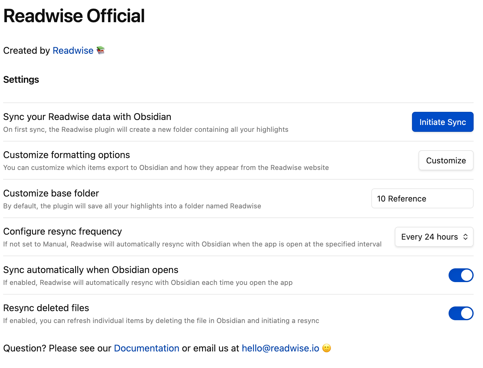 Then when you open your Obsidian vault where the Readwise plugin is installed, it imports all your highlights as notes. The configuration setting in the plugin are pretty simple but they do the job: