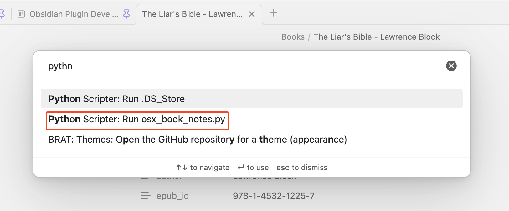 When you want to import highlights. Click Command + P to open the command palette, search for “python” and click on Python Scripter: Run osx_book_notes.py.