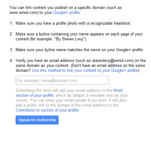 This one may actually be the easiest, if you have an email address on the domain your content is located on, because it is as simple as going to the Google+ Authorship page and entering that email.