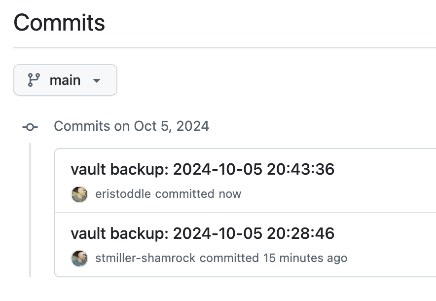 I went back and edited one of the markdown files in the vault, opened the git plugin’s panel again, clicked the + button to stage the changes, and clicked the arrow button to push and I had two vault backups in my repo. That was on a test vault. After that I installed it on my main vault. Now I have a way to roll back my vault easily if I need to.