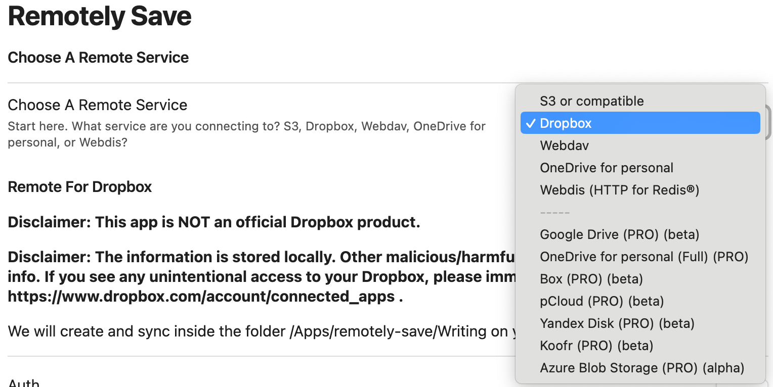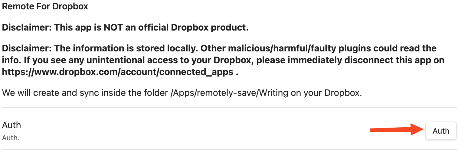 - Click the Auth button. Since I was using Dropbox, this launched a dialog with a link. I clicked the link was taken to Dropbox to authorize the plugin where I clicked another button that took me back to Obsidian and I was done.