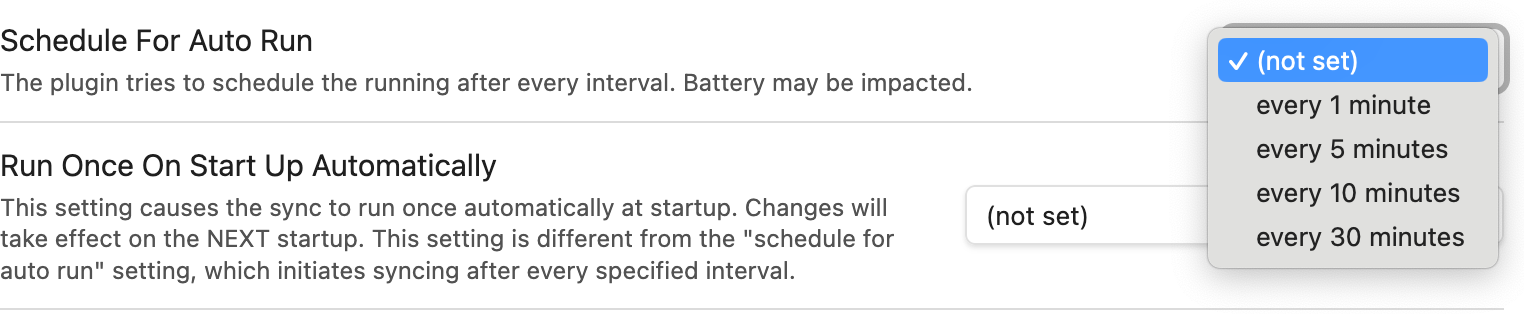 - There are quite a few setting you can configure but the only ones I have touched so far is making sure it syncs on startup and then I have it sync every 5 minutes. Other than that, I can click its button on the menu to sync whenever I want.