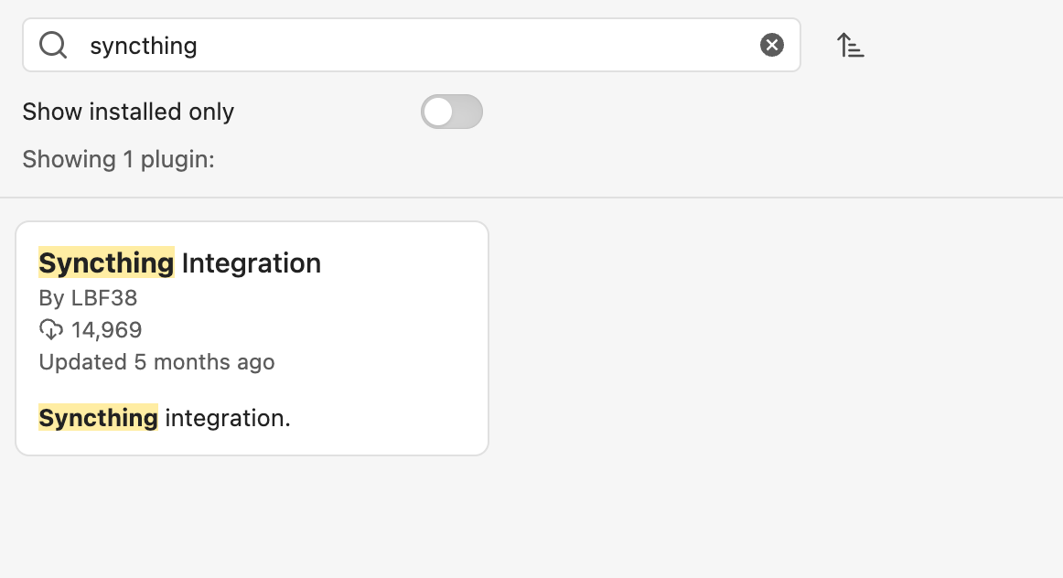Just search for “synchthing integration” in the Obsidian Community Plugins tab to install it.