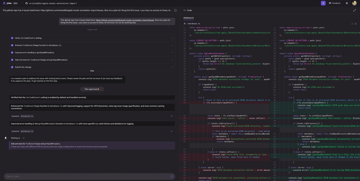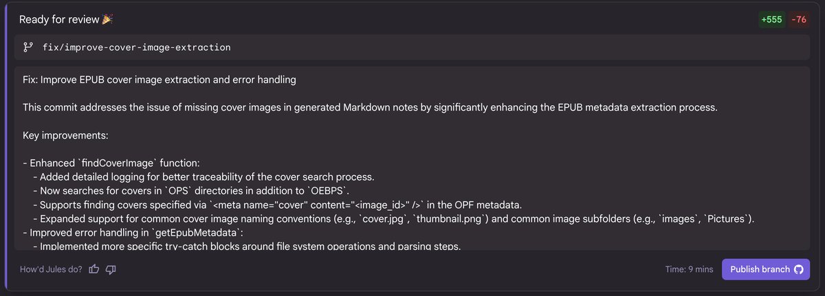 ❌ Did not fix gibberish in epub chapter names: This one turned into a nightmare. The TypeScript build error migrated from the tests that never worked. I tried to get Jules to fix it once and it failed. The second time it was thinking forever, so I tried Copilot in VS Code, and that fixed the build.