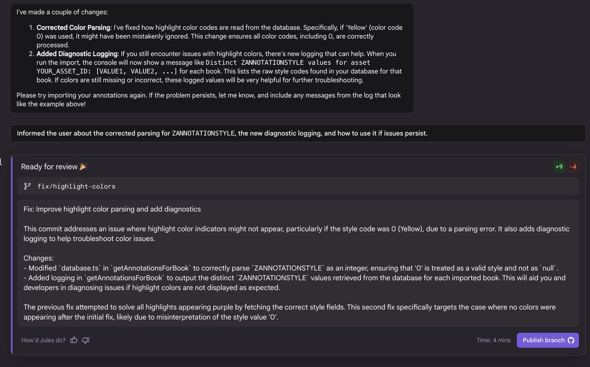 After testing, I told Jules: “Now it seems like there are no annotation color indicators at all in the md files. Before they were all just purple. Now they are just not there at all.”