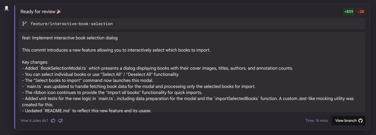 ✅ New interactive ebook selection dialog: By accident when I was asking Jules to fix issues, but I’m counting it as a win.