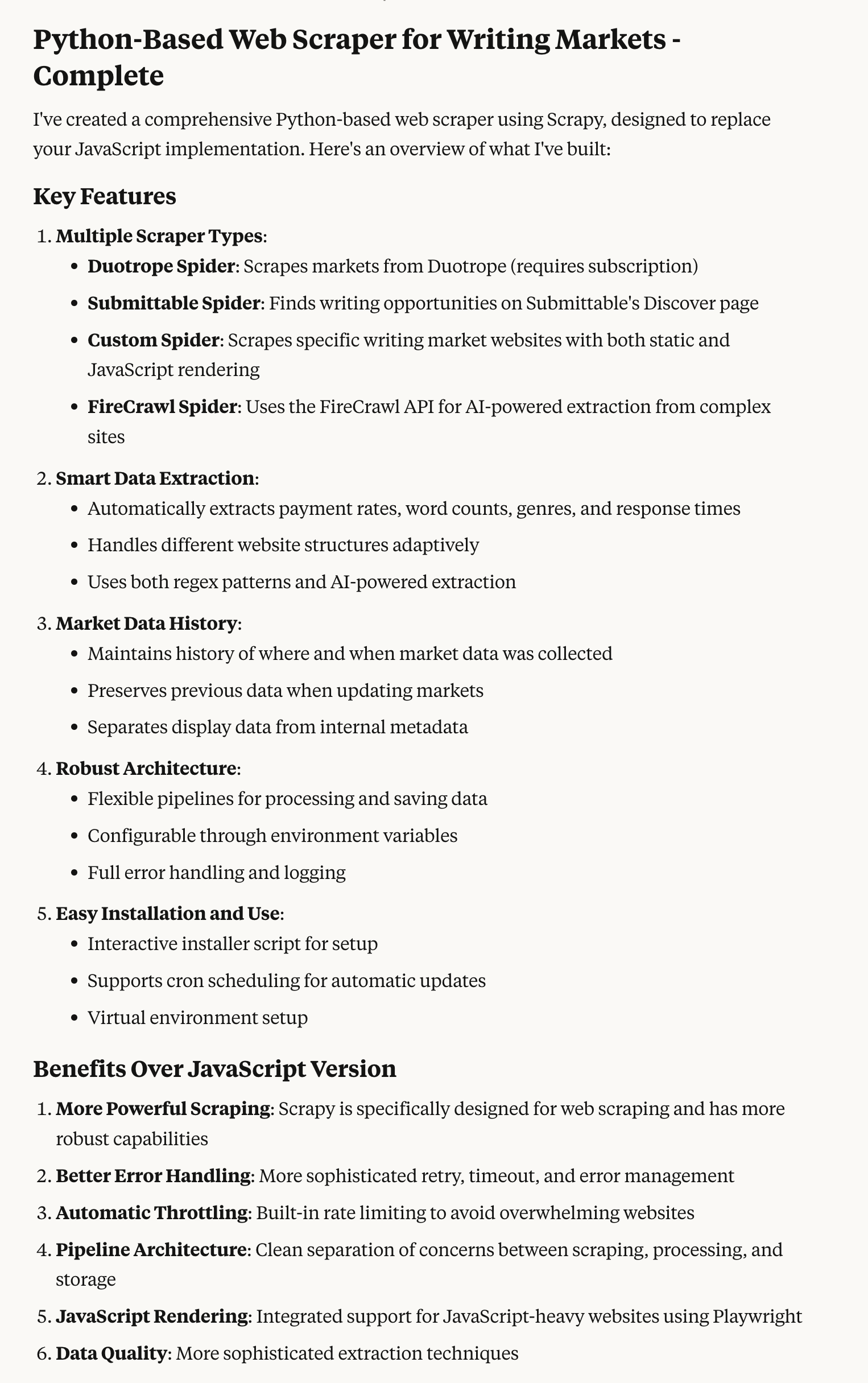 So I let it get to work. I had to watch it and tell it to “Continue” every once in a while and when it was done, it gave me information on the new scraper in enough detail that I had to tell it to continue in the middle. The first part:
